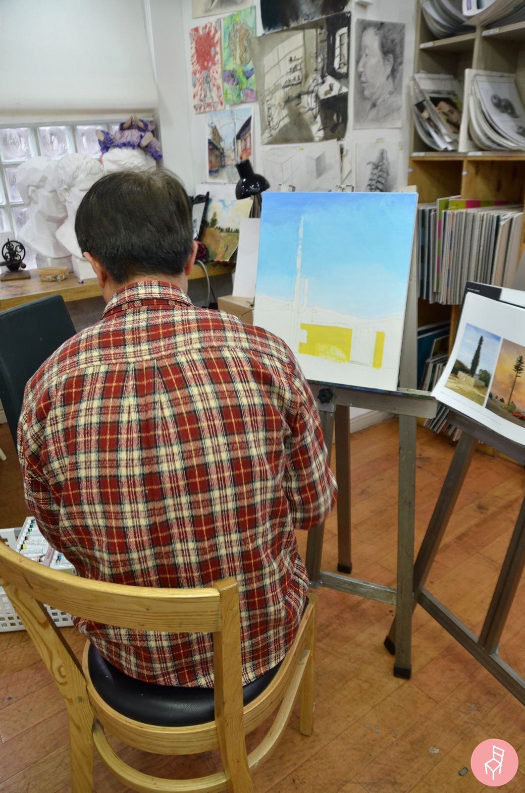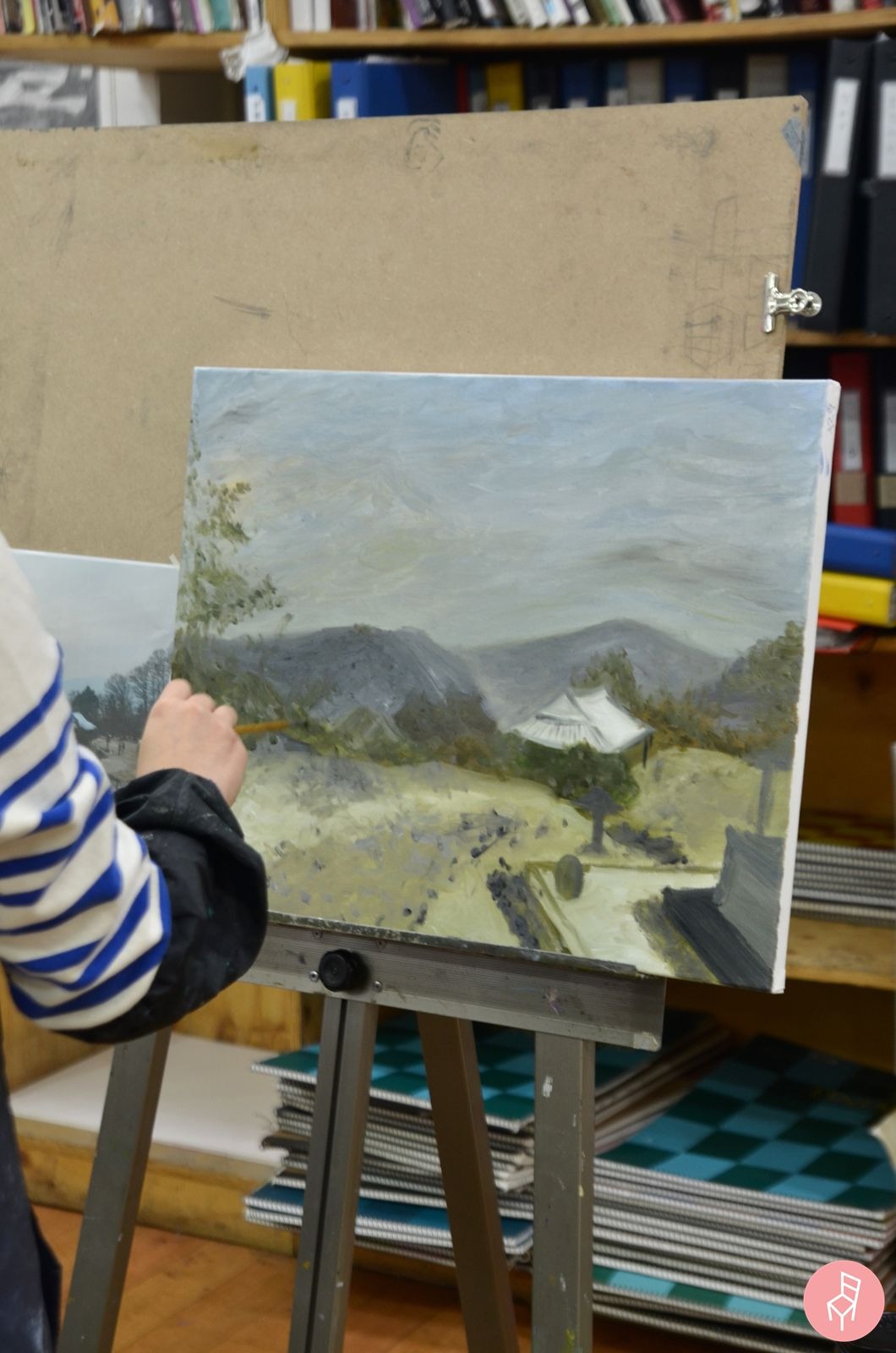 그에 비해 아래 회원님은 유화로 처마가 보이는 풍경을 그리셨는데요. 우거진 수풀과 산은 물론, 산 너머로 보이는 하늘까지 낮은 채도의 색으로 표현하셨습니다. 위에 분이 초록색 계열 외에도 노란색, 파란색, 보라색 등 다양한 계열의 색상을 두루 사용하신 것과는 다르게 아래 회원님은 비슷한 톤의 색상을 사용하셨습니다. 두 작업이 어떻게 마무리 될지 무척 기대되는데요. 작품이 완성되면 그때 다시 소개해드리도록 하겠습니다.