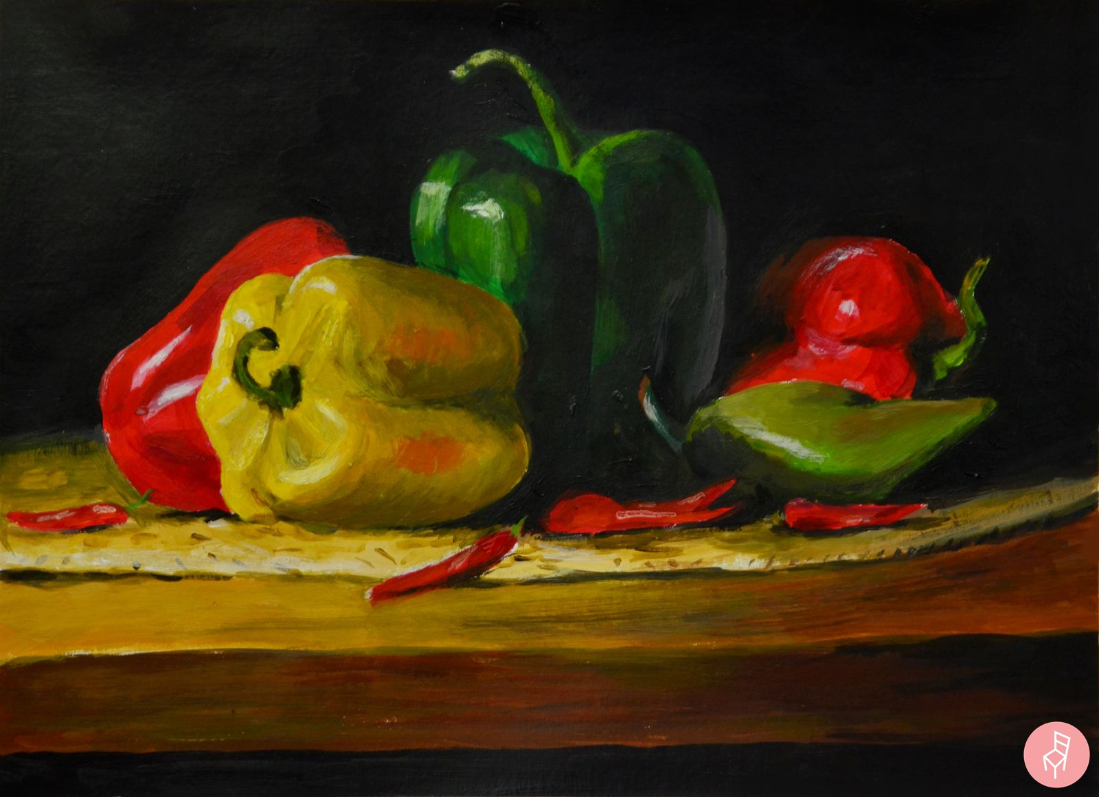 검은색 바탕에 파프리카, 피망 등 다양한 종류의 채소를 그리셨는데요. 파프리카의 말랑한 질감이나 움푹 파여있는 부분을 그림으로 잘 표현하셨습니다. 빛이 들어오는 양도 적절하게 변화를 주셨는데요. 뒤쪽에 놓인 초록색 피망에는 적은 빛이, 왼쪽에 놓인 빨갛고 노란 파프리카에는 많은 빛을 머금고 있다는 걸 확인할 수 있습니다.