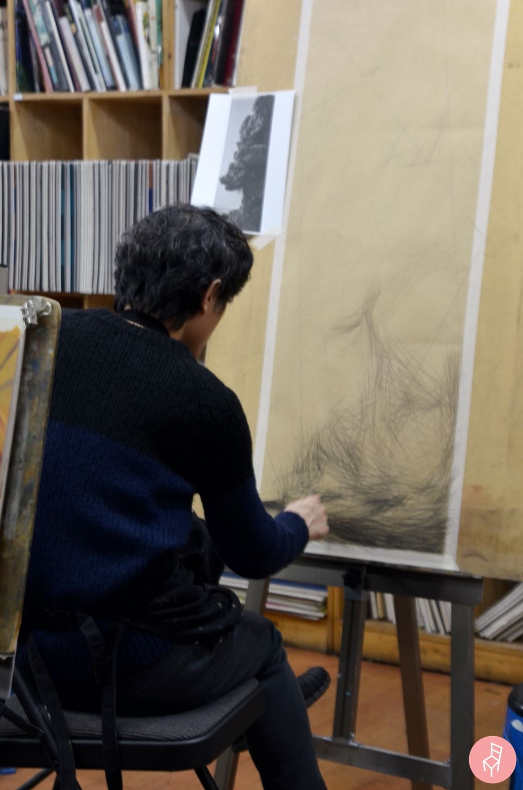 좋은자리 취미미술학원에서 7년 동안 그림을 그리고 계신 남성 회원님은 오늘 드로잉 작업을 시작하셨습니다. 자신의 키만큼 큰 종이에 피어오른 구름의 모습을 담는 작업이었는데요. 연필로 수많은 선을 겹겹이 쌓아 표현하는 방식을 선택하셔서 초기에는 무엇을 표현하려 하시는지 가늠하기가 어려웠습니다.