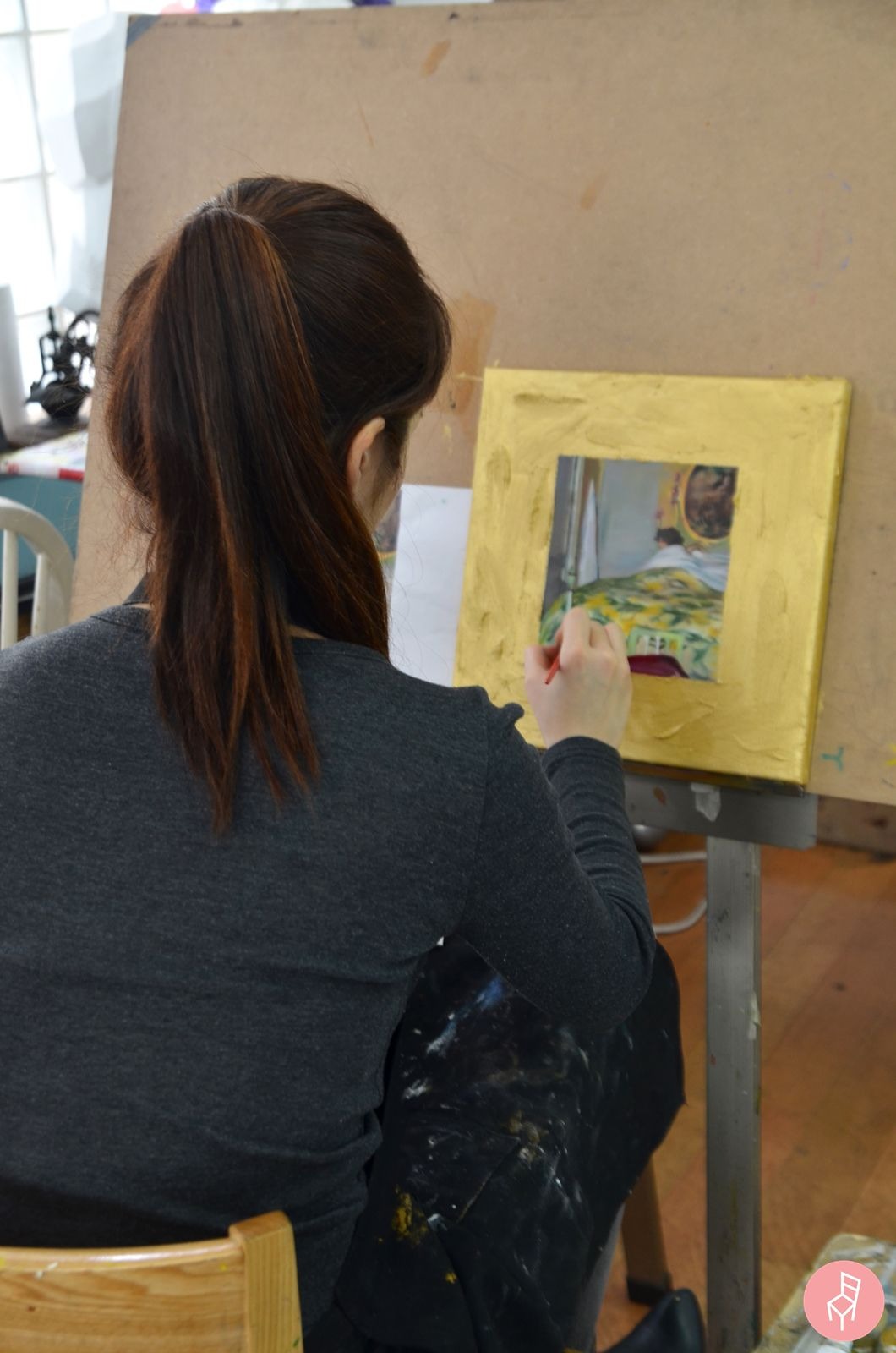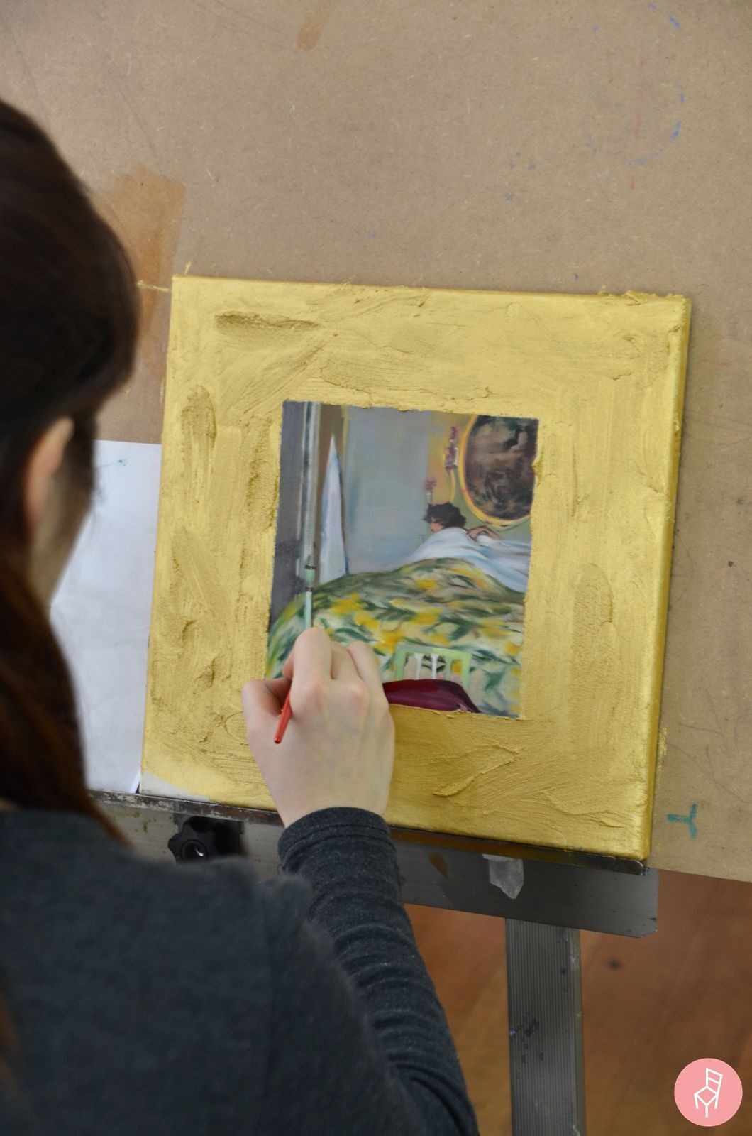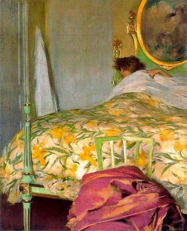 원작보다 어두운 회색을 많이 사용하셨는데요. 원작은 햇살을 받으면서 일어나는 것처럼 느껴지지만, 좋은자리 회원님의 작품은 하늘도 흐리고 기분도 우중충한 날, 굼뜨게 일어나는 느낌이 듭니다. 실제로 카사스의 작품은 잠에서 깬 여인이 외출하기까지 준비하는 과정을 담은 연작인데요. 씻고, 단정하게 옷을 갈아입는 과정까지 담아낸 작품이랍니다.