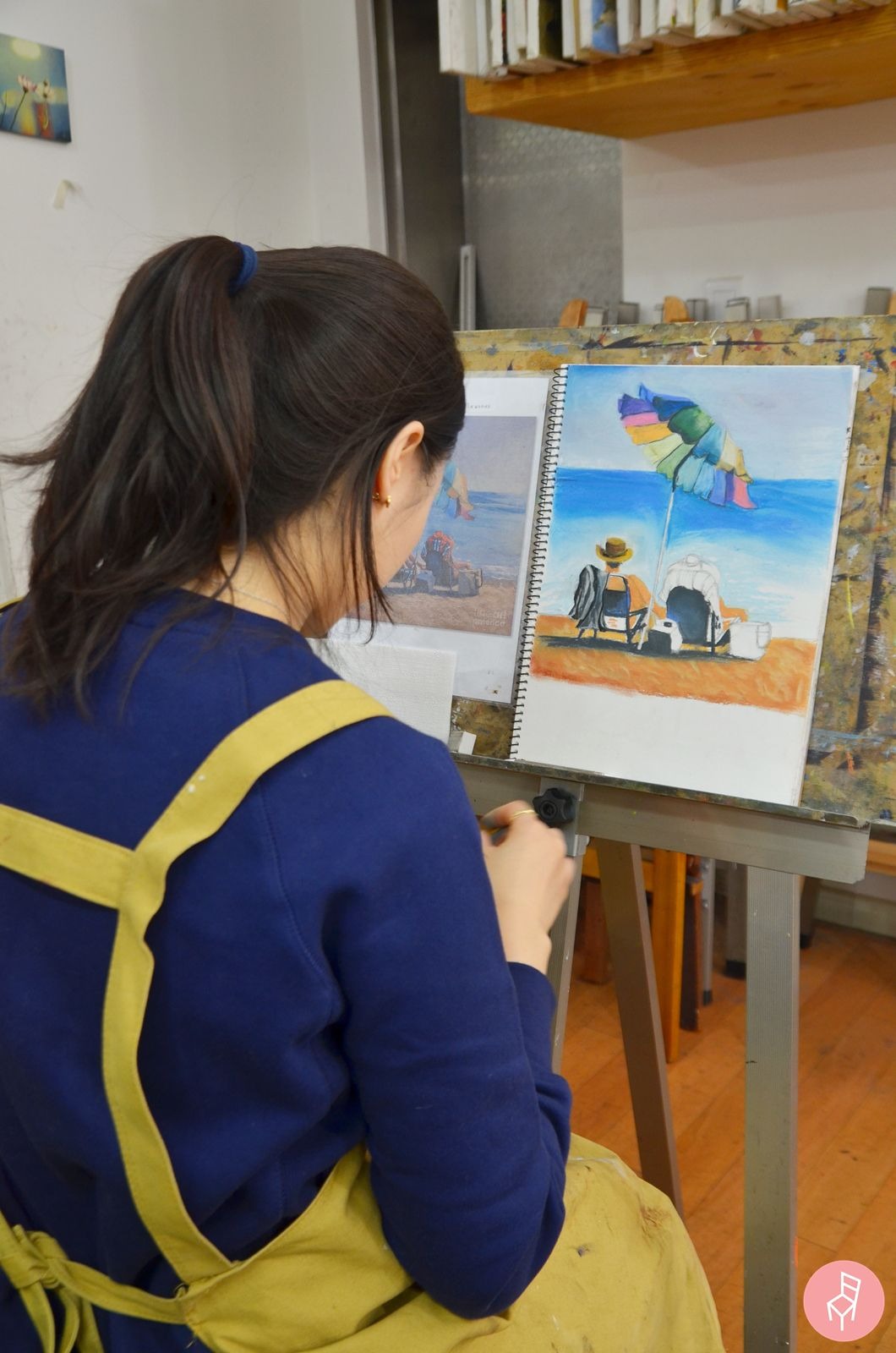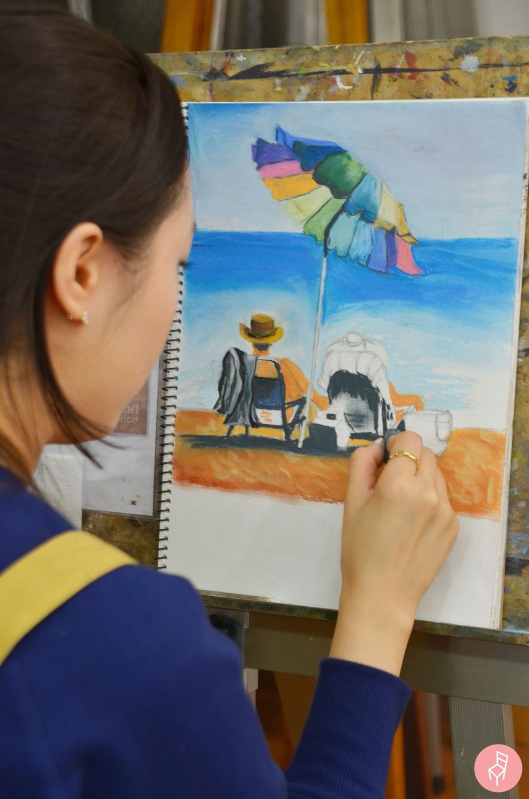 사실적인 표현에 신경을 쓴 원작과는 달리 좋은자리 회원님은 삽화적인 느낌을 강조하셨는데요. 모래알처럼 잘게 흩어진 파스텔의 질감이 모래사장의 느낌을 잘 담아내고 있습니다. 작품의 맺음새는 원작이 뛰어나지만, 좋은자리 회원님의 작품에는 부드럽고 편안한 느낌이 한층 더 강조되지 않았나 싶습니다. 너무너무 잘하셨습니다! :)