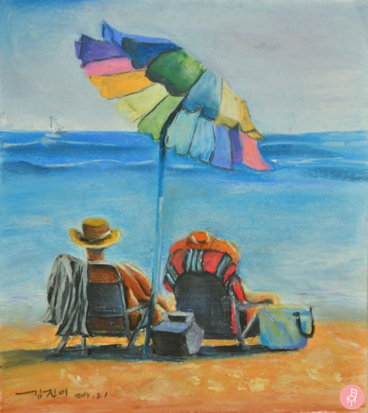 오늘은 파스텔화 작업을 먼저 소개해드릴게요. 푸르딩딩한 바다에 한가로이 누워 시간을 보내는 두 사람, 이 작품은 미국의 Laura Lee Zanghetti가 만든 'Just Leave A Message'입니다. 작품의 제목처럼 전화를 꺼두고 싶은 풍경이죠?